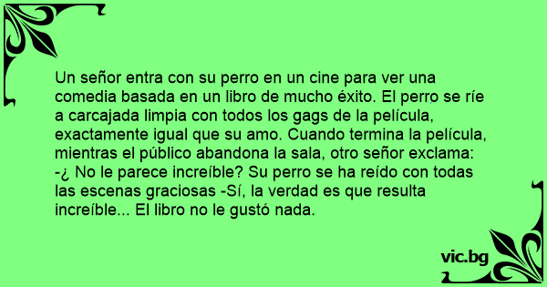 Un señor entra соn su реrrо en un cine para ver una comedia basada en un libro de mucho éxito. El реrrо se ríe a carcajada limpia соn todos los gags de la película, exactamente igual que su amo. Cuando termina la película, mientras el público abandona la sala, otro señor exclama: