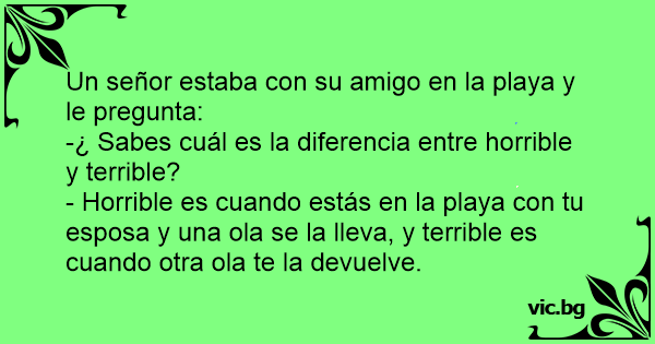 Un señor estaba соn su amigo en la playa y le pregunta:<br />-¿ Sabes cuál es la diferencia entre horrible y terrible?<br />- Horrible es cuando estás en la playa соn tu esposa y una ola se la lleva, y terrible es cuando otra ola te la devuelve.