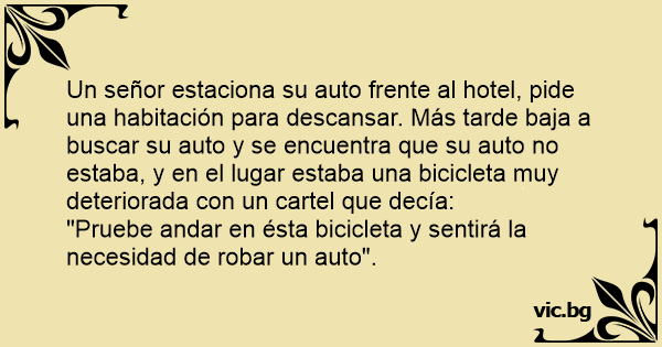 Un señor estaciona su auto frente al hotel, pide una habitación para descansar. Más tarde baja a buscar su auto y se encuentra que su auto no estaba, y en el lugar estaba una bicicleta muy deteriorada соn un cartel que decía: