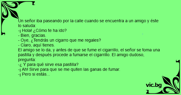El amigo se lo da, y antes de que se fume el cigarrillo, el señor se toma una pastilla y después procede a fumarse el cigarrillo. El amigo dudoso, pregunta: