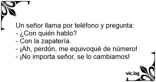 Грешен број Das Telefon klingelt. Negozio di scarpe: Salve, qui è il negozio di scarpe della sig.ra Rossi Mi scusi, ma ho sbagliato numero Non c'è problema signore, se riporta qui le scarpe le diamo subito il numero giusto! - Ало, с кого разговарям? - С продавачката от магазина за обувки. - Сбъркал съм номера... - Няма проблем, елате да ги сменим! Ring, ring, Zapatería Jiménez, ¿Dígame? Ay, perdone, me parece que me equivoqué de número. No hay problema, usted trae los zapatos y le damos el número que haya. Llama un señor a una zapatería y dice el dependiente: Le atiende la zapatería Blanco, ¿En qué le puedo ayudar? Lo siento, me he equivocado de número. Y dice el dependiente: Pues venga aquí y se los... En man beställer ett par skor per telefon. Nästa dag ringer telefonen hos frisörskan. - Skorna jag köpte i går var för små! - Skor?! Ni måste ha fått fel nummer! - Naturligtvis! Dom var ju för små! O telefone toca na Loja de Calçados Coimbra e o gerente Manoel atende. Uma voz pergunta: — De onde fala? — É da Loja de Calcados Coimbra. — Como? — Loja de Calcados Coimbra — repetiu Manoel. — Ih,... Telefonen ringer i skobutikken: "Hallo, kan jeg bytte den kjole jeg købte i går?" "De har vidst fået forkert nummer." "Ja, det er netop derfor jeg gerne vil bytte den!" - Halo? - Sklep obuwniczy, słucham? - Przepraszam, pomyliłem numer... - Nic nie szkodzi. Niech Pan przyjdzie, wymienimy. TRIIIM! Toca o telefone na sapataria do português, que atende: — Alô! Alôô! Casa de Calçados! — Como? – perguntam do outro lado da linha. — Casa de Calçados Coimbra! – repete o português. —...