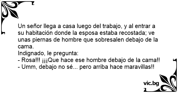 Un señor llega a casa luego del trabajo, y al entrar a su habitación donde la esposa estaba recostada; ve unas piernas de hombre que sobresalen debajo de la cama.