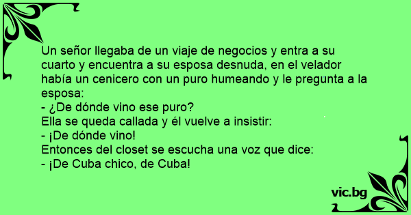 Il marito torna a casa prima del solito orario e trova un sigaro acceso nel portacenere. Si insospettisce e chiede alla moglie: "Da dove viene questo sigaro?" Segue un breve silenzio e poi dall'armadio una voce maschile e tremante risponde: "Da Cuba!"
