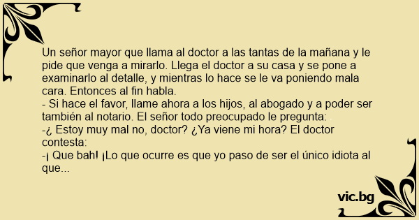 Un señor mayor que llama al doctor a las tantas de la mañana y le pide que venga a mirarlo. Llega el doctor a su casa y se pone a examinarlo al detalle, y mientras lo hace se le va poniendo mala cara. Entonces al fin habla.