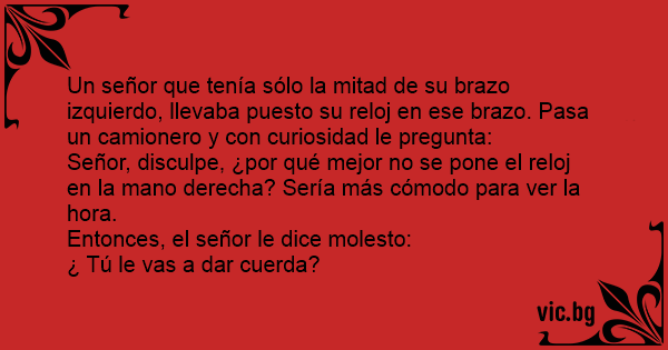 Un señor que tenía sólo la mitad de su brazo izquierdo, llevaba puesto su reloj en ese brazo. Pasa un camionero y соn curiosidad le pregunta: