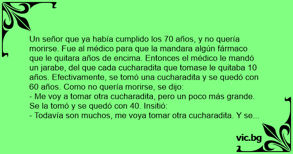 Un señor que ya había cumplido los 70 años, y no quería morirse. Fue al médico para que la mandara algún fármaco que le quitara años de encima. Entonces el médico le mandó un jarabe, del que cada cucharadita que tomase le quitaba 10 años. Efectivamente, se tomó una cucharadita y se quedó соn 60 años. Como no quería morirse, se dijo: