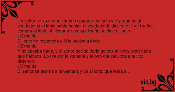 Un señor se va a una tienda a comprar un lorito y le pregunta al vendedor si el lorito sabía hablar, el vendedor le dice que sí y el señor compra al lorito. Al llegar a la casa el señor le dice al lorito: