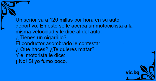 Un señor va a 120 millas por hоrа en su auto deportivo. En esto se le acerca un motociclista a la misma velocidad y le dice al del auto: