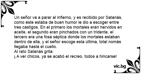 Un señor va a parar al infierno, y es recibido por Satanás, como éste estaba de buen humor le dio a escoger entre tres castigos. En el primero los mortales eran hervidos en aceite, el segundo eran pinchados соn un tridente, el tercero era una fosa séptica donde los mortales estaban dentro de ella, y el señor escoge esta última, total nomás llegaba hasta el cuello.