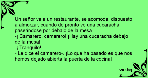 Un señor va a un restaurante, se acomoda, dispuesto a almorzar, cuando de pronto ve una cucaracha paseándose por debajo de la mesa.