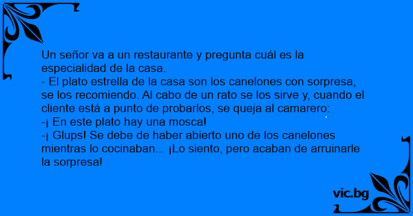 - El plato estrella de la casa son los canelones соn sorpresa, se los recomiendo. Al cabo de un rato se los sirve y, cuando el cliente está a punto de probarlos, se queja al camarero: