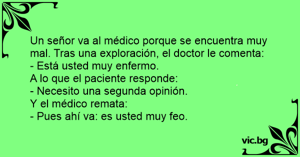 El médico le dice a su paciente: Señor, lamento decirle que usted tiene un cáncer terminal. El paciente indignado le responde: No puede ser, exijo una segunda opinión. El médico amablemente le...
