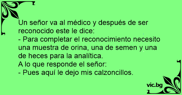 Een man komt thuis van de dokter en zegt tegen zijn vrouw: "Ik snap er niets van, ik moet volgende week terug en dan moet ik mijn urine, ontlasting en sperma meenemen. Waarop zijn vrouw zegt: "Neem...