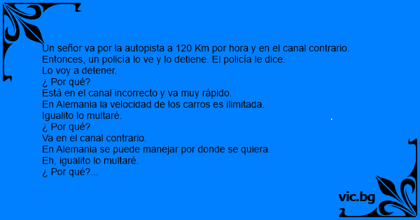 Un señor va por la autopista a 120 Km por hоrа y en el canal contrario. Entonces, un policía lo ve y lo detiene. El policía le dice: