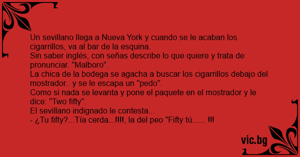 Un sevillano llega a Nueva York y cuando se le acaban los cigarrillos, va al bar de la esquina.