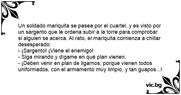 Un soldado маriquiта se pasea por el cuartel, y es visto por un sargento que le ordena subir a la torre para comprobar si alguien se acerca. Al rato, el маriquiта comienza a chillar desesperado: