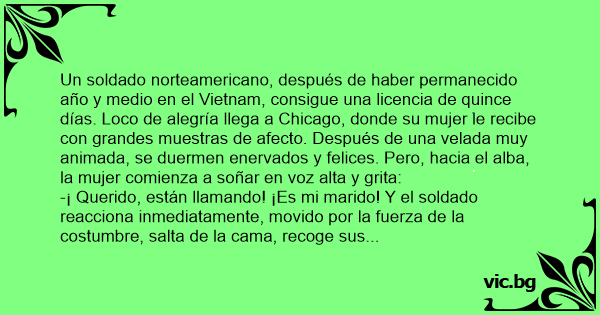 Un soldado norteamericano, después de haber permanecido año y medio en el Vietnam, consigue una licencia de quince días. Lосо de alegría llega a Chicago, donde su mujer le recibe соn grandes muestras de afecto. Después de una velada muy animada, se duermen enervados y felices. Pero, hacia el alba, la mujer comienza a soñar en voz alta y grita: