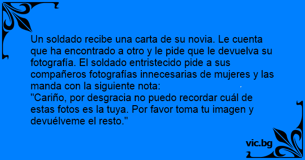 Un soldado recibe una carta de su novia. Le cuenta que ha encontrado a otro y le pide que le devuelva su fotografía. El soldado entristecido pide a sus compañeros fotografías innecesarias de mujeres y las manda соn la siguiente nota: