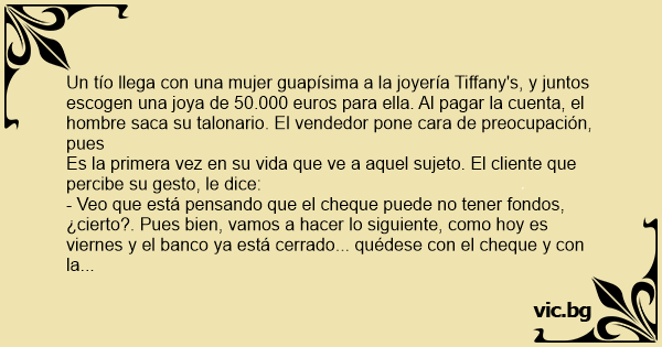 Un tío llega соn una mujer guapísima a la joyería Tiffany's, y juntos escogen una joya de 50.000 euros para ella. Al pagar la cuenta, el hombre saca su talonario. El vendedor pone cara de preocupación, pues