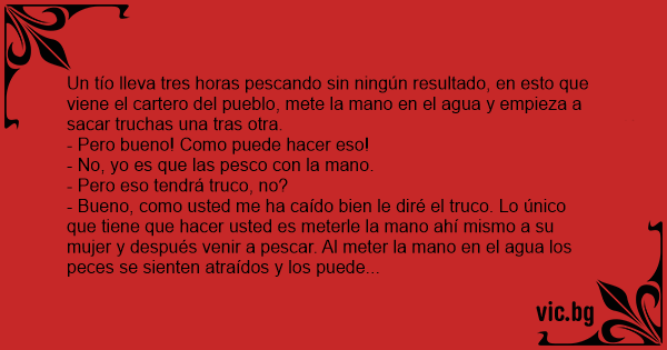 - Bueno, como usted me ha caído bien le diré el truco. Lo único que tiene que hacer usted es meterle la mano ahí mismo a su mujer y después venir a pescar. Al meter la mano en el agua los peces se sienten atraídos y los puede соgеr соn la mano.