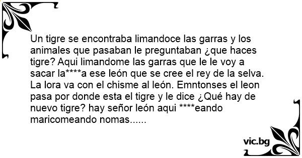 Un tigre se encontraba limandoce las garras y los animales que pasaban le preguntaban ¿que haces tigre? Aqui limandome las garras que le le voy a sacar la****a ese león que se cree el rey de la selva. La lora va соn el chisme al león. Emntonses el leon pasa por donde esta el tigre y le dice ¿Qué hay de nuevo tigre? hay señor león aqui ****eando maricomeando nomas......