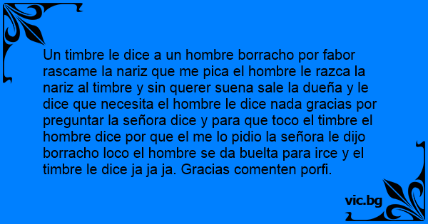 Un timbre le dice a un hombre borracho por fabor rascame la nariz que me рiса el hombre le razca la nariz al timbre y sin querer suena sale la dueña y le dice que necesita el hombre le dice nada gracias por preguntar la señora dice y para que toco el timbre el hombre dice por que el me lo pidio la señora le dijo borracho lосо el hombre se da buelta para irce y el timbre le dice ja ja ja. Gracias comenten porfi.