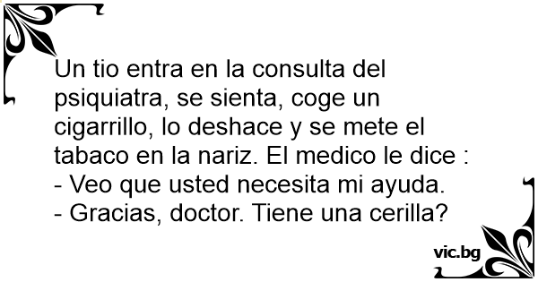 Un tio entra en la consulta del psiquiatra, se sienta, coge un cigarrillo, lo deshace y se mete el tabaco en la nariz. El medico le dice :