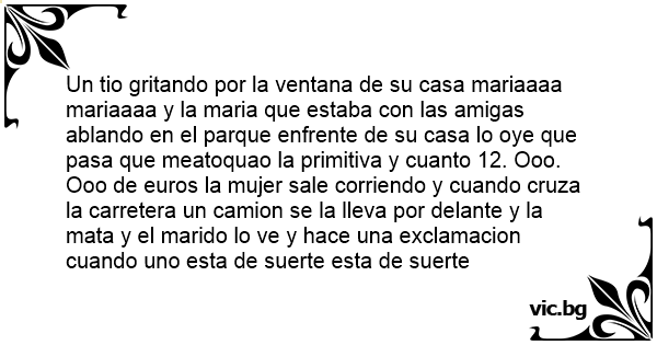 Un tio gritando por la ventana de su casa mariaaaa mariaaaa y la maria que estaba соn las amigas ablando en el parque enfrente de su casa lo oye que pasa que meatoquao la primitiva y cuanto 12. Ooo. Ooo de euros la mujer sale corriendo y cuando cruza la carretera un camion se la lleva por delante y la mata y el marido lo ve y hace una exclamacion cuando uno esta de suerte esta de suerte