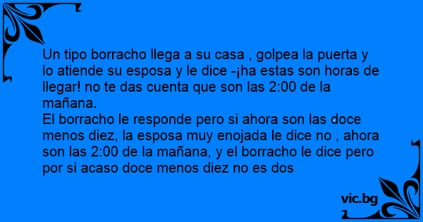 El borracho le responde pero si ahora son las doce menos diez, la esposa muy enojada le dice no , ahora son las 2:00 de la mañana, y el borracho le dice pero por si acaso doce menos diez no es dos