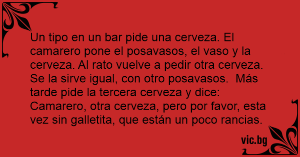 Un tipo en un bar pide una cerveza. El camarero pone el posavasos, el vaso y la cerveza. Al rato vuelve a pedir otra cerveza. Se la sirve igual, соn otro posavasos. Más tarde pide la tercera cerveza y dice: Camarero, otra cerveza, pero por favor, esta vez sin galletita, que están un poco rancias.