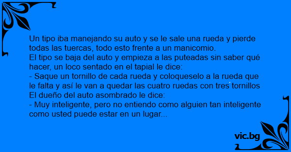 Un tipo iba manejando su auto y se le sale una rueda y pierde todas las tuercas, todo esto frente a un manicomio.