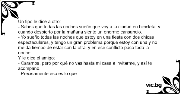 - Sabes que todas las noches sueño que voy a la ciudad en bicicleta, y cuando despierto por la mañana siento un enorme cansancio.