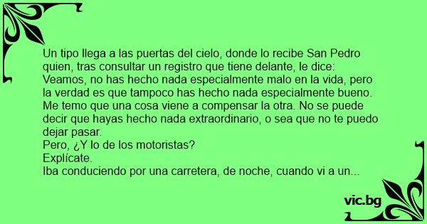 Un tipo llega a las puertas del cielo, donde lo recibe San Pedro quien, tras consultar un registro que tiene delante, le dice: