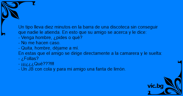 Un tipo lleva diez minutos en la barra de una discoteca sin conseguir que nadie le atienda. En esto que su amigo se acerca y le dice: