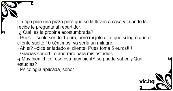 Un tipo pide una pizza para que se la lleven a casa y cuando la recibe le pregunta al repartidor: