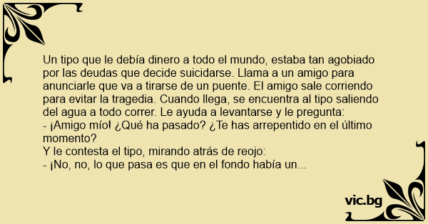 Un tipo que le debía dinero a todo el mundo, estaba tan agobiado por las deudas que decide suicidarse. Llama a un amigo para anunciarle que va a tirarse de un puente. El amigo sale corriendo para evitar la tragedia. Cuando llega, se encuentra al tipo saliendo del agua a todo correr. Le ayuda a levantarse y le pregunta: