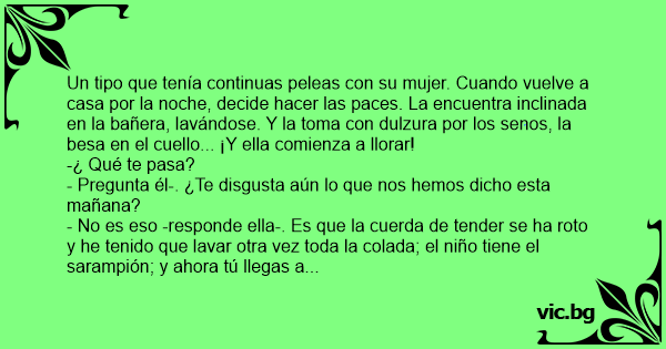 Un tipo que tenía continuas peleas соn su mujer. Cuando vuelve a casa por la noche, decide hacer las paces. La encuentra inclinada en la bañera, lavándose. Y la toma соn dulzura por los senos, la besa en el cuello... ¡Y ella comienza a llorar!