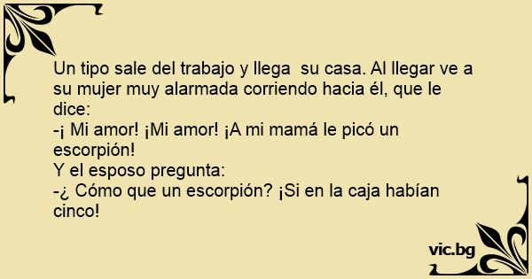 Мъж се прибира от работа, насреща жена му тича разтревожена и вика: - Скъпи, мама я ужили един скорпион... Мужик приходит домой с работы, ему навстречу выбегает встревоженная жена и кричит: Un señor llega de su trabajo y ve a su esposa muy angustiada que corre hacia él gritando: ¡ Mi amor! ¡Mi amor! ¡A mi mamá la picó un alacrán! Y el esposo le pregunta: ¿ Cómo que un alacrán? ¡Si...