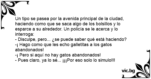 Un tipo se pasea por la avenida principal de la ciudad, haciendo como que se saca algo de los bolsillos y lo esparce a su alrededor. Un policía se le acerca y lo interroga: