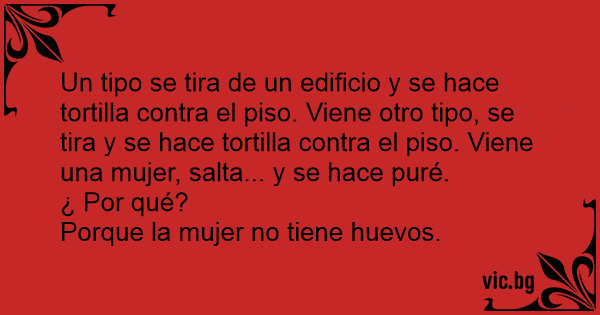 Un tipo se tira de un edificio y se hace tortilla contra el piso. Viene otro tipo, se tira y se hace tortilla contra el piso. Viene una mujer, salta... y se hace puré.