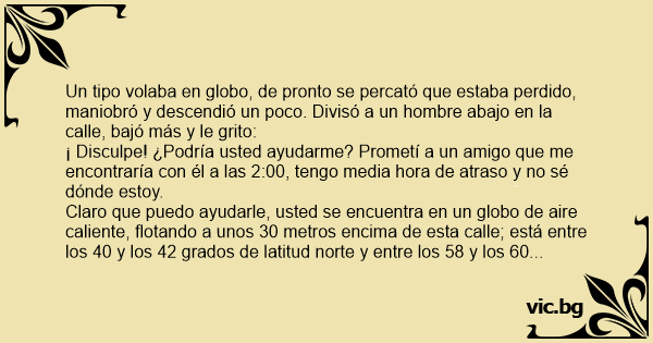 Un hombre está volando en un globo aerostático y se da cuenta de que se encuentra perdido. Mientras hace algunas maniobras ve a un tipo caminando por el campo. El hombre hace descender el globo algunos metros y grita: - Perdone, ¿me puede decir dónde estoy?. A lo que el hombre que está abajo...