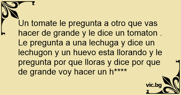 Un tomate le pregunta a otro que vas hacer de grande y le dice un tomaton . Le pregunta a una lechuga y dice un lechugon y un huеvо esta llorando y le pregunta por que lloras y dice por que de grande voy hacer un h****