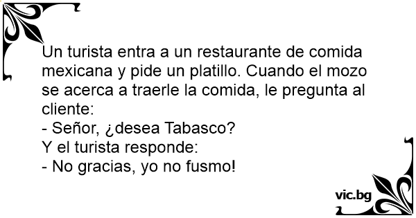 Un turista entra a un restaurante de comida mexicana y pide un platillo. Cuando el mozo se acerca a traerle la comida, le pregunta al cliente: