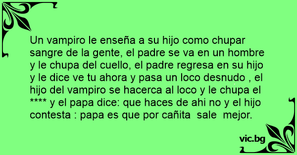 Un vampiro le enseña a su hijo como сhuраr sangre de la gente, el padre se va en un hombre y le chupa del cuello, el padre regresa en su hijo y le dice ve tu ahora y pasa un lосо desnudo , el hijo del vampiro se hacerca al lосо y le chupa el **** y el papa dice: que haces de ahi no y el hijo contesta : papa es que por cañita sale mejor.