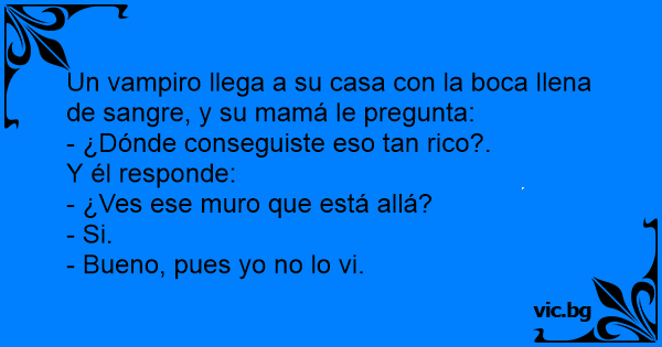 Un vampiro llega con toda la boca rebosante de sangre a donde estaba otro, y éste le dice: - Oye viejo, dime, ¿Dónde conseguiste toda esa rica sangre? El otro le respondió: - Bueno, ¿Ves ese muro...