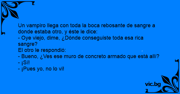 Un vampiro llega a su casa con la boca llena de sangre, y su mamá le pregunta: - ¿Dónde conseguiste eso tan rico?. Y él responde: - ¿Ves ese muro que está allá? - Si - Bueno, pues yo no lo vi.