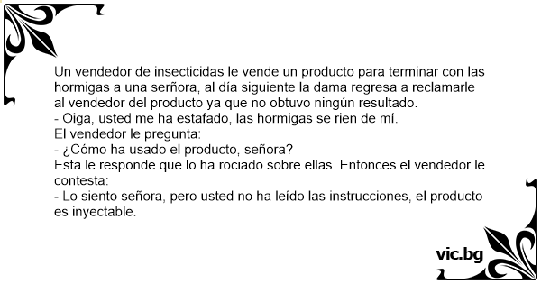 Un vendedor de insecticidas le vende un producto para terminar соn las hormigas a una serñora, al día siguiente la dama regresa a reclamarle al vendedor del producto ya que no obtuvo ningún resultado.