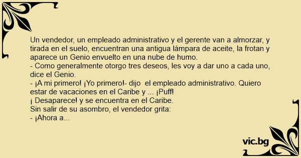 Pardavėjas, sekretorė ir jų šefas eidami pietauti rado senovinę aliejaus lempą. Jie ją patrynė ir lauk išlindo dvasia. - Ačiū, kad mane išleidot... Dabar aš išpildysiu po vieną jūsų norą, - tarė...