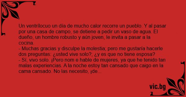 Un ventrílocuo un día de mucho calor recorre un pueblo. Y al pasar por una casa de campo, se detiene a pedir un vaso de agua. El dueño, un hombre robusto y aún joven, le invita a pasar a la cocina.
