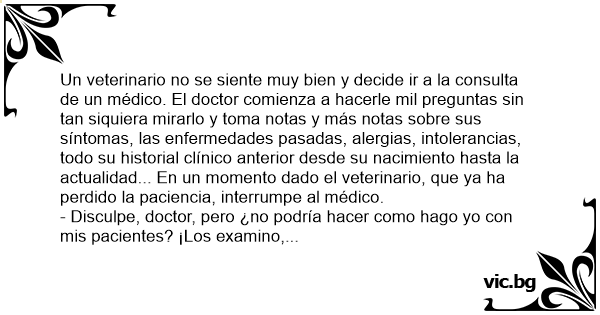 Un veterinario no se siente muy bien y decide ir a la consulta de un médico. El doctor comienza a hacerle mil preguntas sin tan siquiera mirarlo y toma notas y más notas sobre sus síntomas, las enfermedades pasadas, alergias, intolerancias, todo su historial clínico anterior desde su nacimiento hasta la actualidad... En un momento dado el veterinario, que ya ha perdido la paciencia, interrumpe al médico.